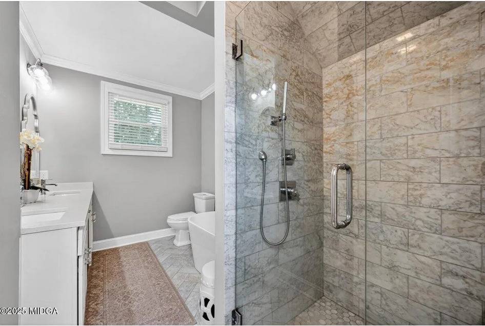 The primary suite, conveniently located on the main level, is a private retreat designed for relaxation. Spacious yet intimate, it offers a peaceful escape with a luxurious en suite bath and generous closet space. The modern finishes complement the home’s classic architecture, creating a perfect blend of old and new.
